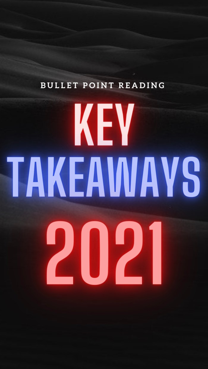 Every year, the goal of Bullet Point Reading is to read 52 books, one a week, and share the noteworthy findings. What are the overlapping ideas that span multiple books, across a variety of genres? That’s what we are looking at today. All books are further linked to Goodreads, Amazon and the full takeaways. Top … Continue reading BIGGEST TAKEAWAYS OF 2021!