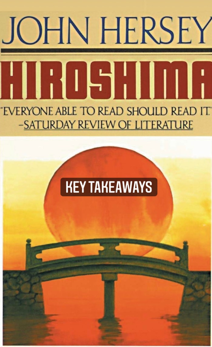 Hiroshima covers the chaos that unfolds on August 6th 1945 from the perspective of six different civilians. John Hersey skips the details of the war to highlight their personal experience during the attack. RATING: 3.5/5 CHECK IT OUT: GOODREADS or AMAZON KEY TAKEAWAYS: In a city of 240,000, nearly 100,000 people had been killed or … Continue reading Hiroshima By John Hersey